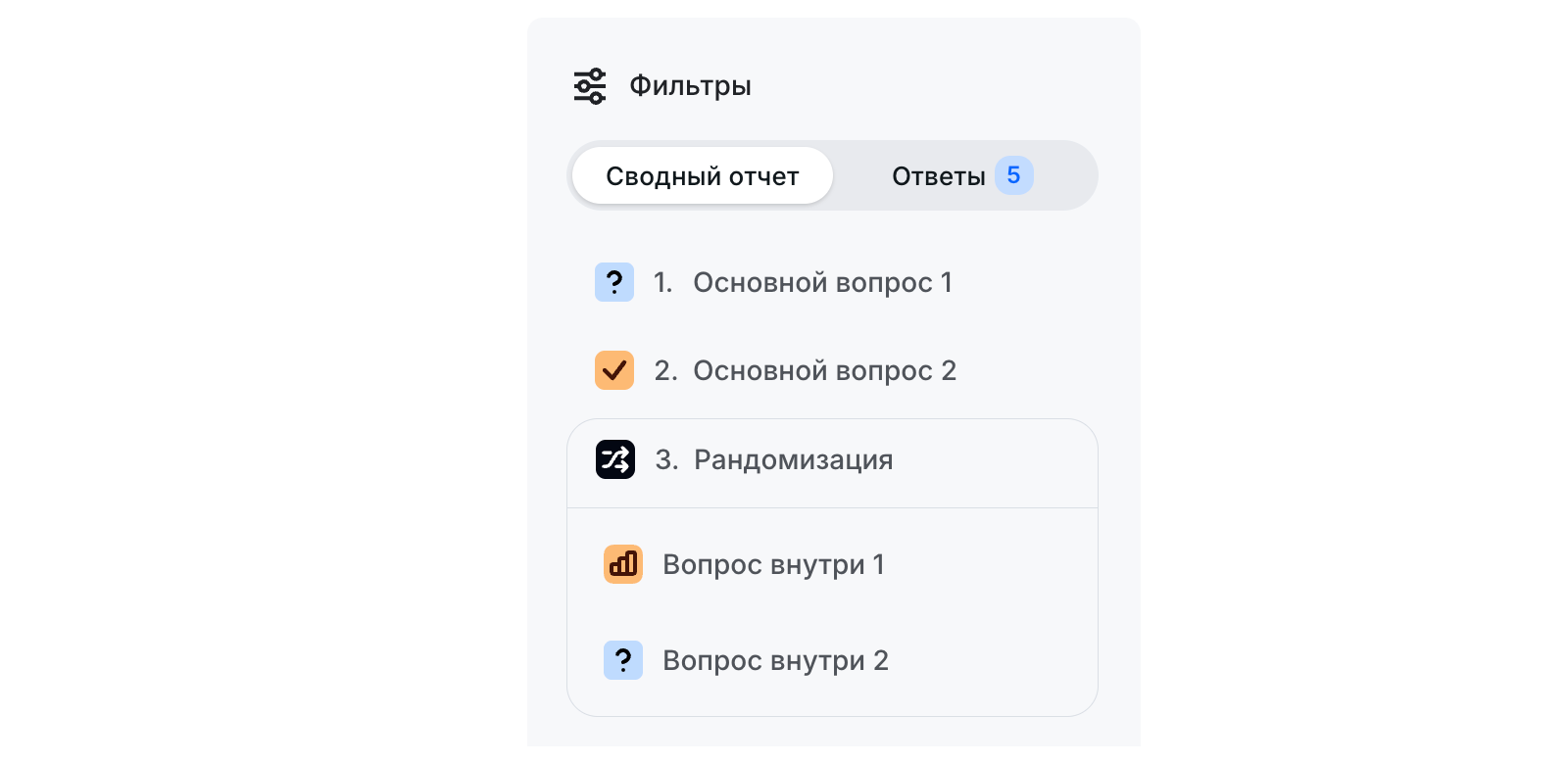 В сводном отчёте содержимое Рандомизации показывается вместе, одной группой. В отчете по индивидуальным ответам порядок блоков будет такой же, как в редакторе теста.